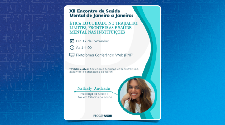 O XII Encontro de Saúde Mental de Janeiro a Janeiro realizado pela Pró-Reitoria de Gestão de Pessoas (Progep) da Universidade do Estado do Rio Grande do Norte (Uern) discutirá, no dia 17 de dezembro, “Ética do cuidado no trabalho: Limites, fronteiras e saúde mental nas instituições”.