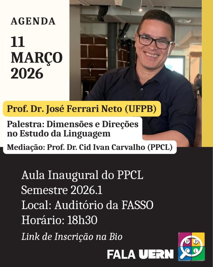O professor Dr. José Ferrari Neto da Universidade Federal da Paraíba (UFPB) ministrará a aula inaugura do semestre 2026.1 do Programa de Pós-graduação em Ciências da Linguagem da Universidade do Estado do Rio Grande do Norte (PPCL/Uern).