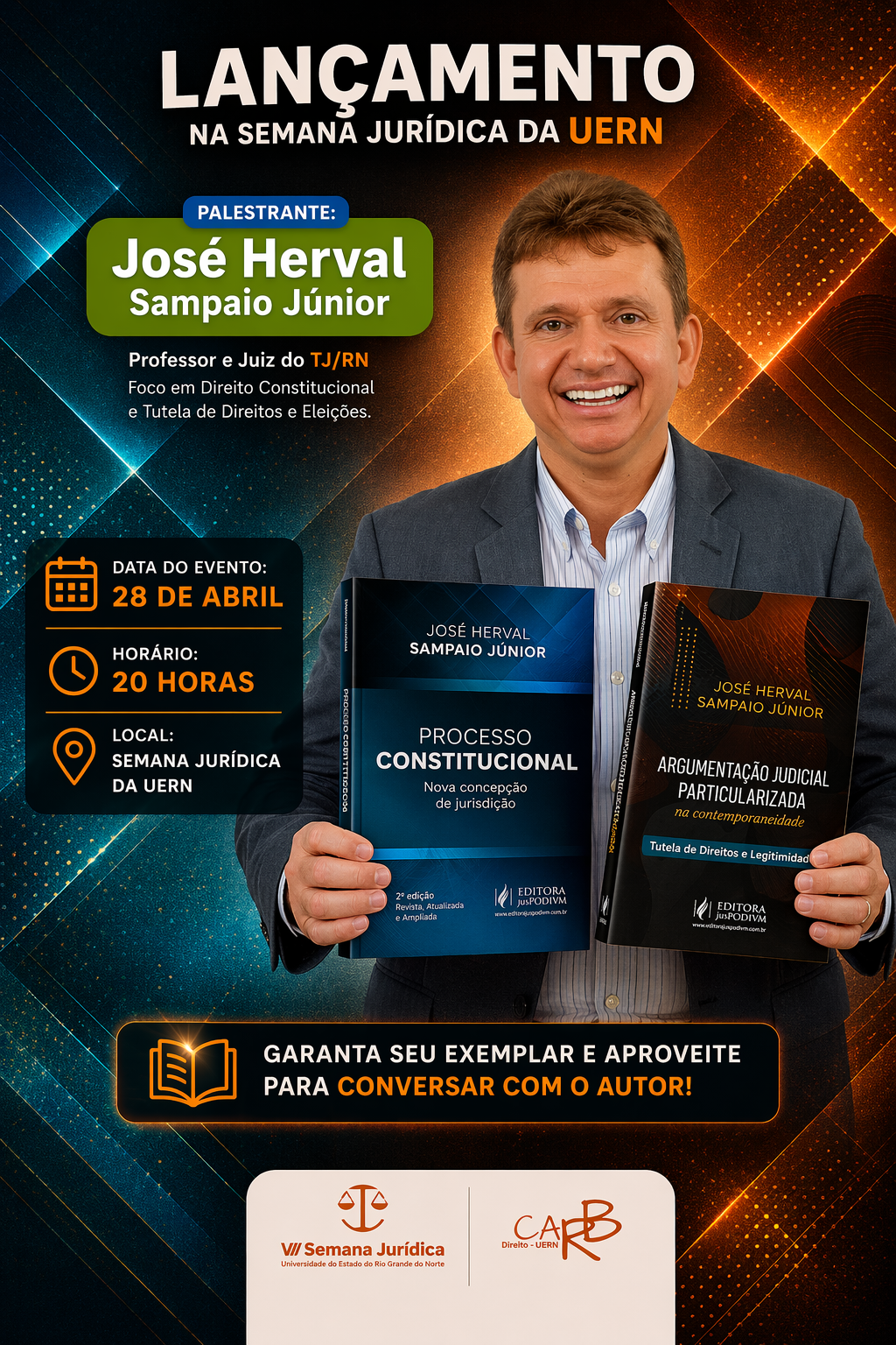 O professor e juiz de direito Herval Sampaio Junior lançará dois livros durante a Semana Jurídica da Uern no próximo dia 28 de abril, às 20h.