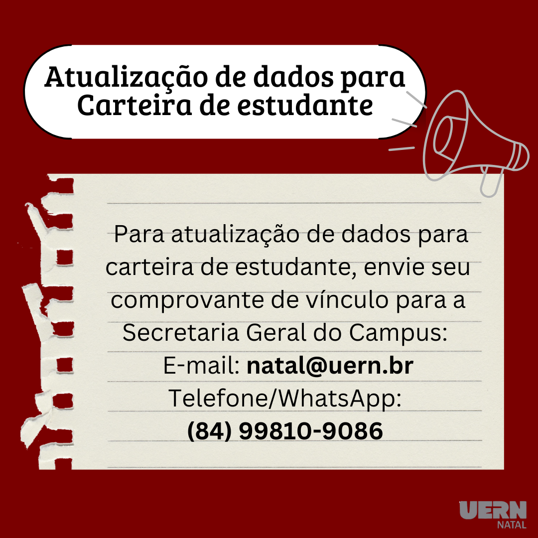 Para atualização da carteirinha de estudante: envie seu comprovante de vínculo para natal@uern.br